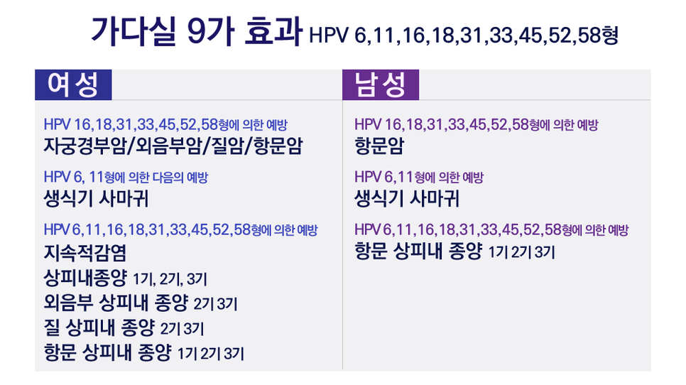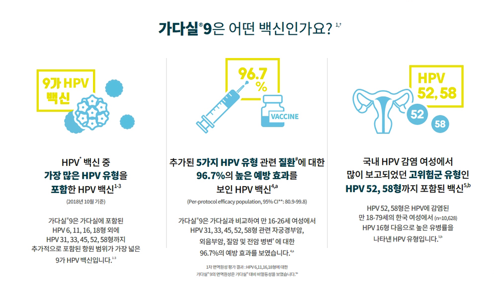 최근 가다실9의 국내 접종 범위가 확대되어 기존 남녀모두 만 9세~26세로 한정이었으나 만 27세~25세 여성도 3회 접종이 가능해졌습니다.