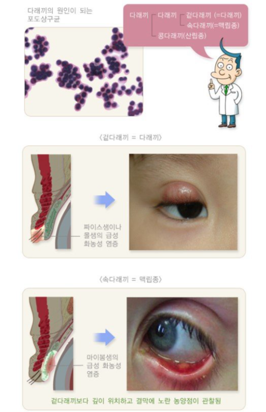 세균에 의해 감염되지만 전염성이 있는 것은 아닙니다. 내부적인 요인으로도 다래끼가 생기는데 눈꺼풀의 분비샘이 막힌 경우가 그렇습니다.