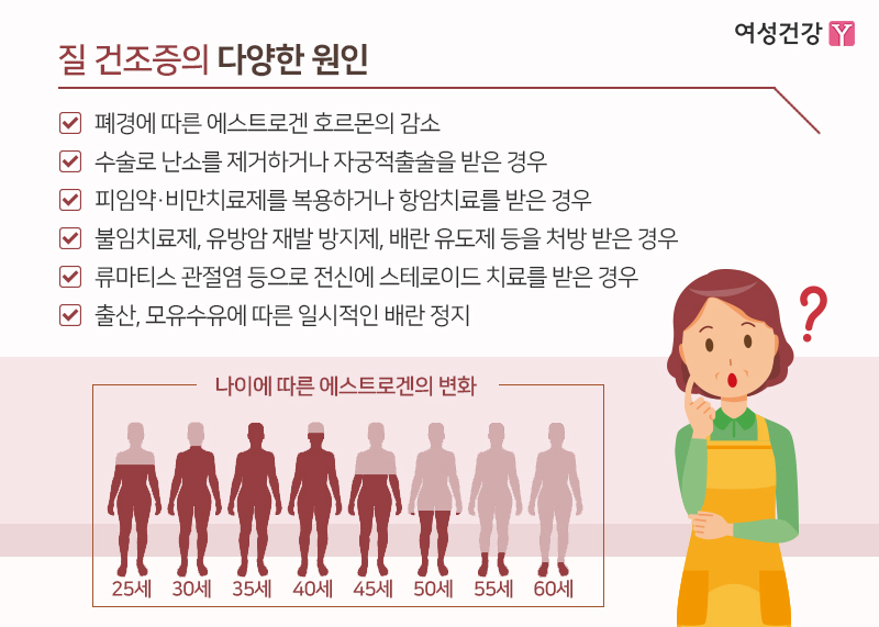 이렇듯 질 건조증은 여성 질환 중 하나로 성기능 장애의 가장 흔한 요인 중 하나입니다. 질내 분비되는 질액이 적거나 분비되지 않는 증상을 말합니다. 증상이 악화되면 질내 환경이 악화되며 질 점막이 수축되고 세균 감염에 취약해집니다. 결국 질염으로 이어질 확률이 높아집니다.