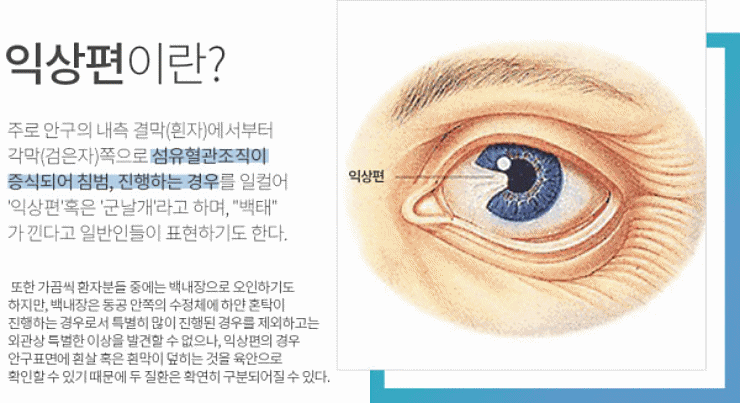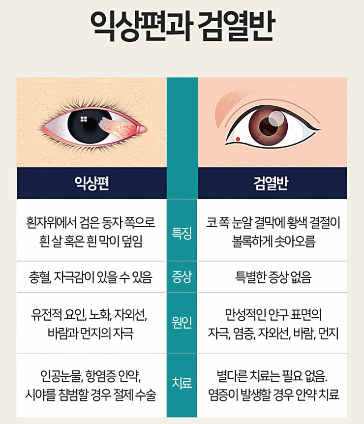검열반은 50대 이상의 남녀에게 흔히 나타나는 대표적인 안질환입니다. 눈흰자에 변형이 생겨 쌀알의 이물질이 생기는 질환입니다. 변셩된 단백질과 지방질로 구성된 볼록 솟은 모양의 노란색 덩어리 형태입니다. 다행인것은 눈 기능에 큰 영향을 끼치진 않지만 이물감 때문에 일상생활에 불편함을 초래할 수 있습니다. 수술적 치료를 요하지 않으며 스테로이드제의 안약과 같은 약물 처방으로 치료를 진행합니다.
