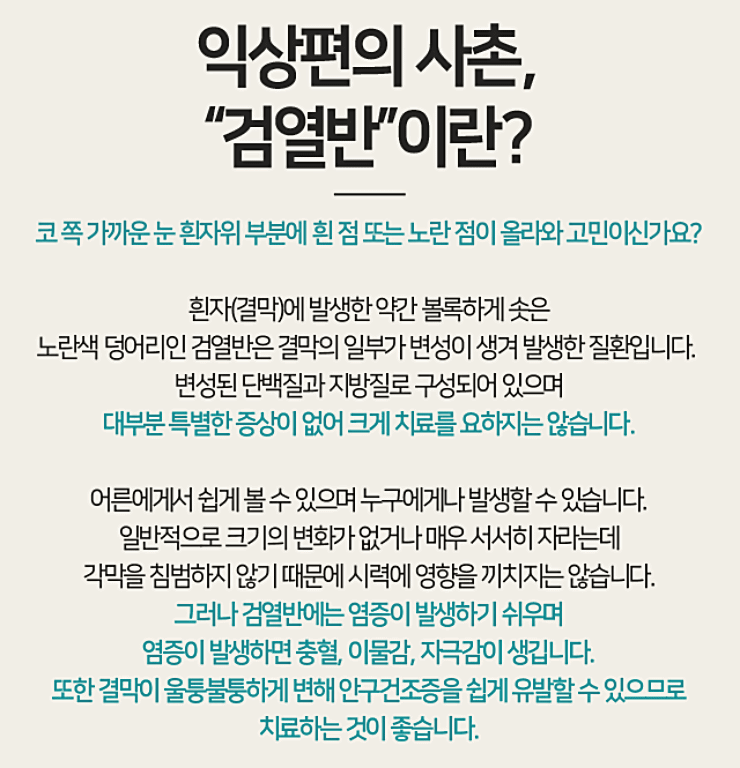 검열반은 50대 이상의 남녀에게 흔히 나타나는 대표적인 안질환입니다. 눈흰자에 변형이 생겨 쌀알의 이물질이 생기는 질환입니다. 변셩된 단백질과 지방질로 구성된 볼록 솟은 모양의 노란색 덩어리 형태입니다. 다행인것은 눈 기능에 큰 영향을 끼치진 않지만 이물감 때문에 일상생활에 불편함을 초래할 수 있습니다. 수술적 치료를 요하지 않으며 스테로이드제의 안약과 같은 약물 처방으로 치료를 진행합니다.