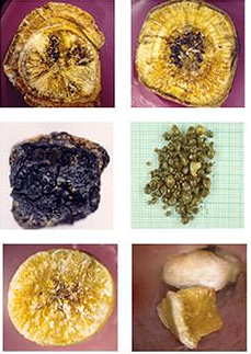 콜레스테롤이 뭉쳐진 담석입니다. 황갈색을 띄며 성분의 90% 이상이 순수 콜레스테롤입니다. 이는 콜레스테롤 과분비를 시키며 간접적으로 담낭 운동 저하 등 기능 장애를 일으킵니다.
