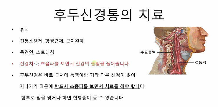 그외 저주파 물리치료, 카이로프랙틱(추나요법)을 통해 근육을 부드럽게 풀어주는 방법도 좋습니다. 특히 추나요법의 경우 건강보험이 적용되어 가격적인 부담이 줄어들었습니다. 연간 20회 본인부담금 20%~50%로 후두 신경통을 포함 각종 통증에 추나요법을 받는 분이 늘고 있습니다.