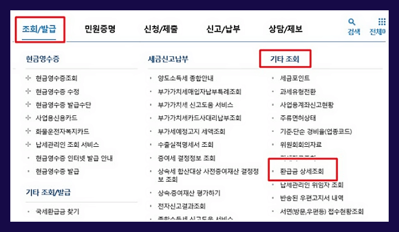 PC로 접속하는 것을 권장하며 메인 홈페이지 > 자주찾는 메뉴 > 환급금 조회하기에서 가능하다.