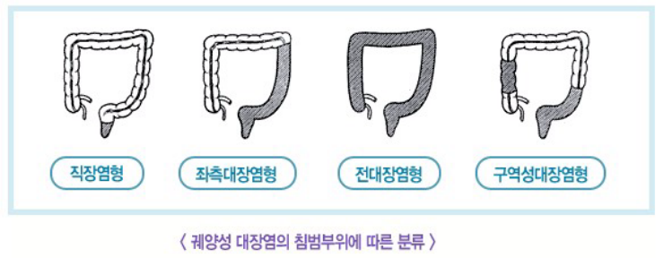 궤양성 대장염은 대장점막에 다발적 궤양이 발생하고 점막이 충혈되거나 붓는 질환입니다. 크론병은 대장 외의 장기에도 발생할 수 있는 것이 특징입니다.