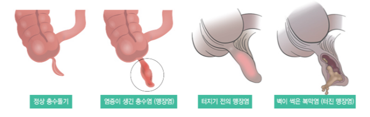 맹장염의 경우는 치료시간을 놓치고 시간이 흐르면 나중에 복막염으로 진행이 될 수 있어 주의가 필요합니다. 맹장염은 충수돌기염, 충수염이 정식 명칭입니다.