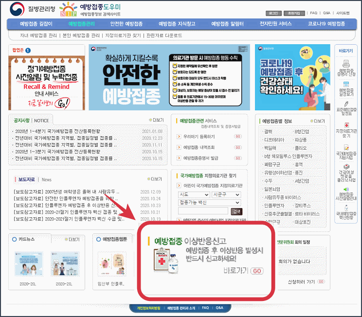 질병관리청은 예방접종 이상반응 페이지를 운영하고 있습니다. ▼ 하단의 이미지를 참고하시기 바랍니다.