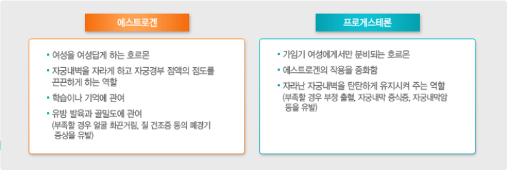 에스트로겐은 난소에서만 만들어지는 호르몬이며 프로게스테론은 난소 뿐만 아니라 임신 시 태반, 부신피질에서도 생성됩니다. 에스트로겐은 자궁 내막을 두껍게 하며 배란을 돕고 임신을 유지시켜주며 유즙을 생산을 위해 유방을 자극합니다. 프로게스테론은 자궁 주변 조직을 튼튼하게 하며 근육을 두텁게 유지시켜 임신 시 배아의 착상을 유지시켜줍니다.