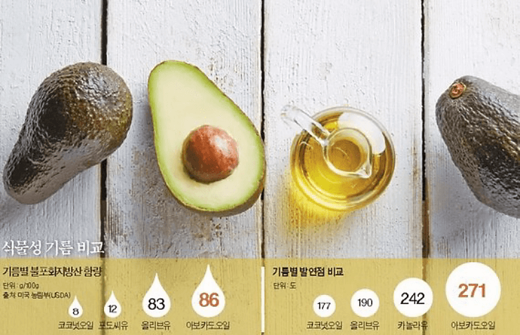 아보카도 오일을 추천하는 이유는 발연점이 높기 때문입니다. 아보카도 오일은 270도, 올리브 오일은 190도로 발연점이 높습니다. 발연점이 높으면 음식의 영양소 손실을 방지하고 튀김 요리를 할 때도 사용하기 좋습니다.