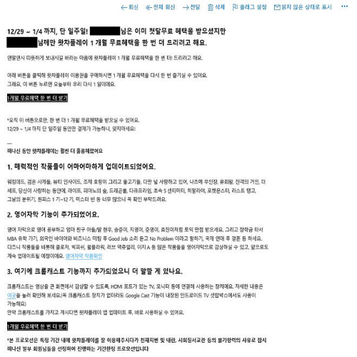 왓챠 플레이를 신규 고객은 구독 무료 이벤트를 제공하여 의무 사용 기간이 없어 언제든지 쉽게 해지 및 취소할 수 있습니다.