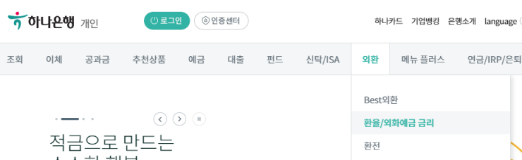 하나은행 접속 후 외환 메뉴를 클릭합니다. 좌측 외환 메뉴에서 환율/외화예금 금리를 선택 후 조회합니다. 홈페이지를 통한 환율 조회는 회원가입/로그인이 필요 없으며 누구나 이용 가능합니다.