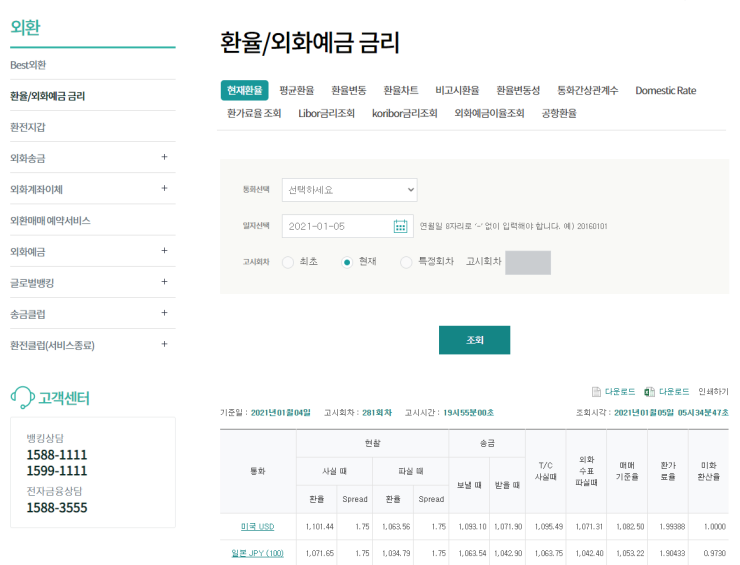 하나은행 홈페이지를 통해서 검색하는 경우 현재환율, 평균 환율 등 환율뿐만 아니라 금리 변동까지 확인 가능합니다. 또한 직접 날짜를 선택해 과거 환율까지 확인 가능하며 통화를 선택 다양한 나라에 대한 환율을 확인할 수 있습니다. 특히 시간별 환율 변동을 확인 가능하고 이것을 다운로드할 수 있는 것이 가장 큰 장점입니다.