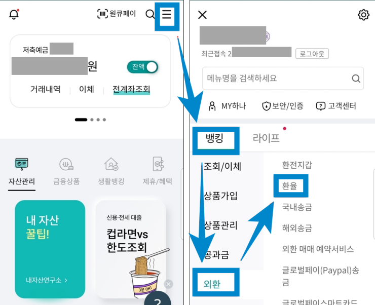 하나원큐 앱을 실행합니다. 홈페이지와 달리 로그인을 합니다. 오른편 상단 삼색 메뉴바를 선택 후 뱅킹 선택, 외환 선택 후 환율 조회가 가능합니다.