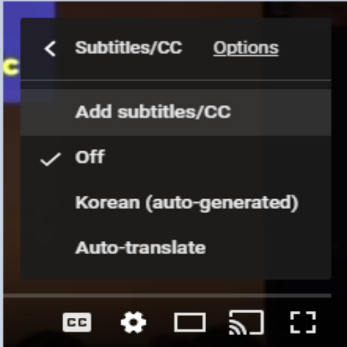 드롭 다운 설정 팝업 창이 화면에 표시되면 항목에서 [자막]을 클릭합니다. "Off"를 선택하면 유튜브 동영상의 자동 자막이 꺼지고 "영어" 또는 "한국어 (자동 생성)"또는 자동 번역을 선택하면 유튜브 자막이 켜집니다.