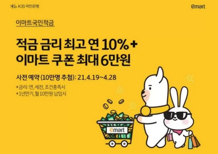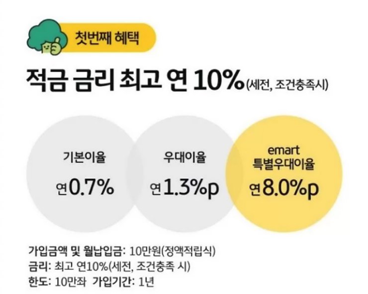 - 기본 이율 연 0.7% + 우대 이율 연 1.3% + 이마트 특별우대이율 연 8.0%