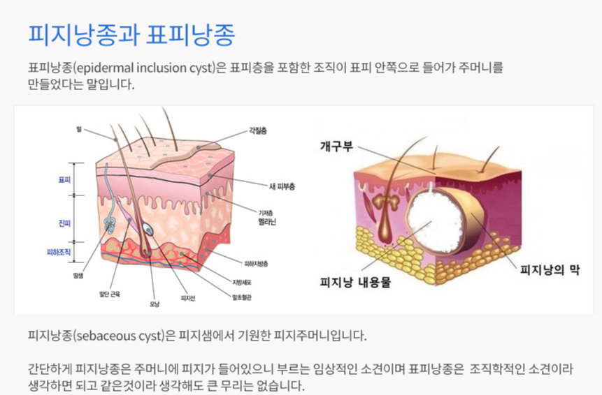 피지 낭종과 지방종은 그 생김새가 비슷합니다. 피지 낭종은 피지통로가 막혀 그 안에 피지가 쌓이는 경우입니다. 말랑말랑하며 피지를 짜는 경우 심한 악취를 동반합니다.
