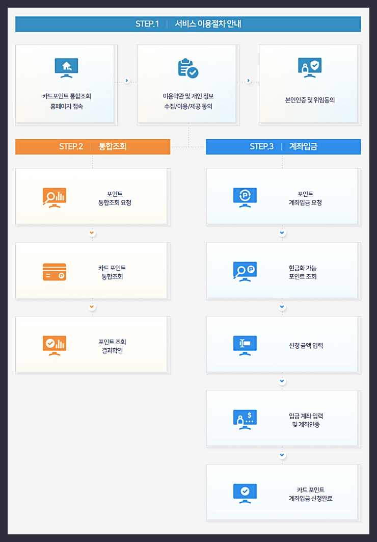 전체적인 과정은 위와 같습니다. 카드 포인트 통합조회 홈페이지에 접속 후 나오는 "휴대폰 피싱 보호 인증 후 이용하기"를 선택합니다. 본인인증 및 위임 동의를 마치면 포인트 통합조회 후 잔여 포인트를 확인합니다. 이후 포인트 계좌 입금 요청을 합니다.