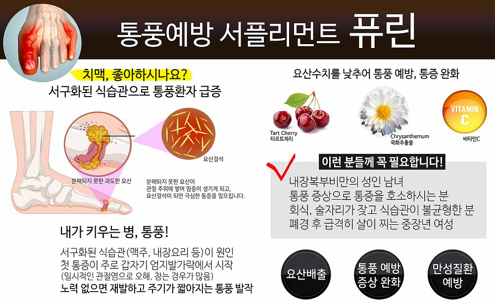사람이 음식을 체내에 흡수하고 대사할 때 발생하는 퓨린이라는 물질이 있습니다. 퓨린이 완벽히 대사 되지 않고 인체에 남아있게 되면 요산염 형태로 존재하게 됩니다.