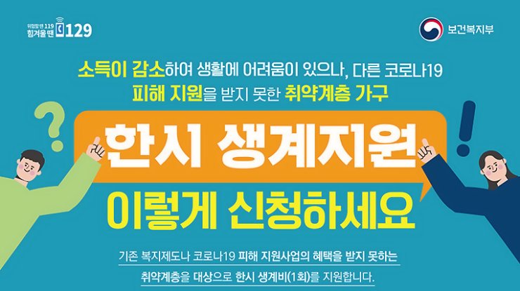 기존 복지제도나 코로나19 피해 지원사업의 혜택을 받지 못하는 취약계층을 대상으로 한시 생계비(1회)를 지원합니다. '한시 생계지원'의 온라인신청은 '21.5.10.(월) 09:00 ~ 5.28.(금) 22:00 까지 복지로에서 신청하실 수 있습니다.