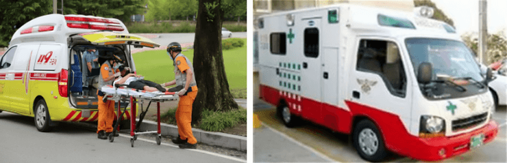 일반 구급차는 기본 의료장비와, 의약품을 갖춘 차량입니다. 대부분 경미한 환자 이송 시에 이용됩니다. 특수구급차는 중환자 이송에 특화된 차량입니다. 차에는 특수한 의료장비를 갖추고 있습니다. 기본요금 외에 거리에 따른 추가 요금도 요구됩니다.