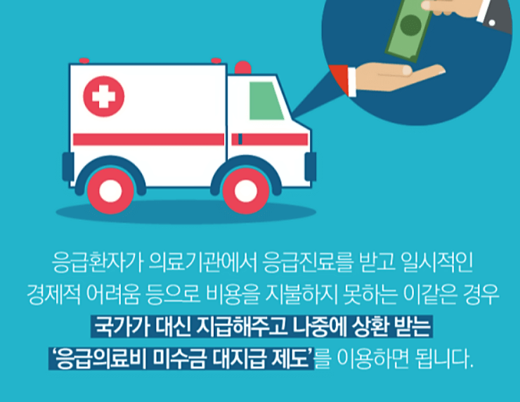 이와 같은 제도를 [응급의료비용 미수금 대지급 제도]라 합니다. 응급의료비용 미수금 대지급 제도는 응급환자가 응급 의료 이송을 제공받고 응급의료 비용을 국가가 대신 지급해 주고 차후 환자 본인을 포함한 상환 의무자로부터 돌려받는 제도를 이야기합니다.