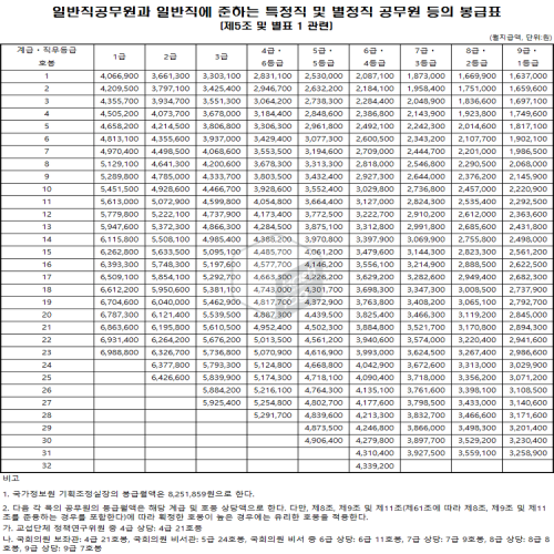 공무원은 매년 정기 승진을 통해 연봉이 상승하도록 돼 있는 연봉의 성격에 대한 보상제도입니다. 급여 체계에 따른 월급표는 직종별로 다르게 책정돼 있으며, 월급 외 근무성적 등 업무 실적에 따라 지급되는 성과급(실적)인 성과상여금 등 각종 수당을 지급합니다.