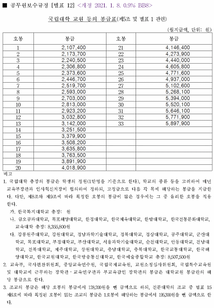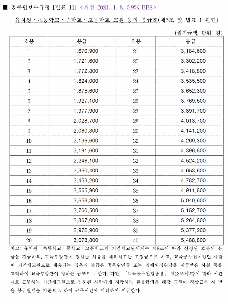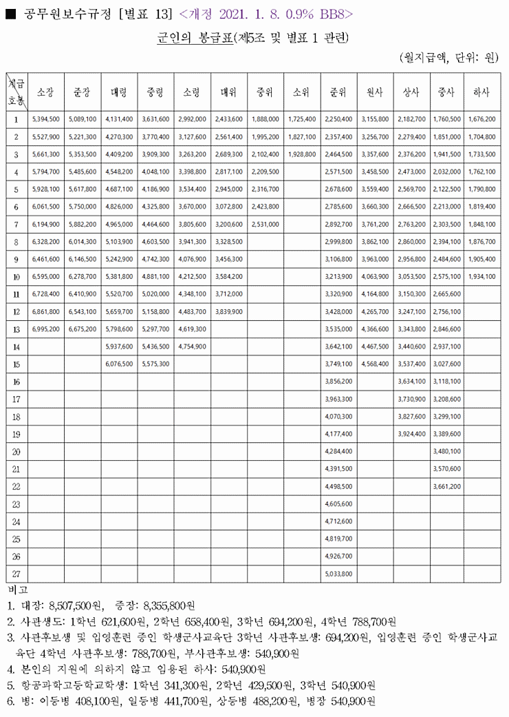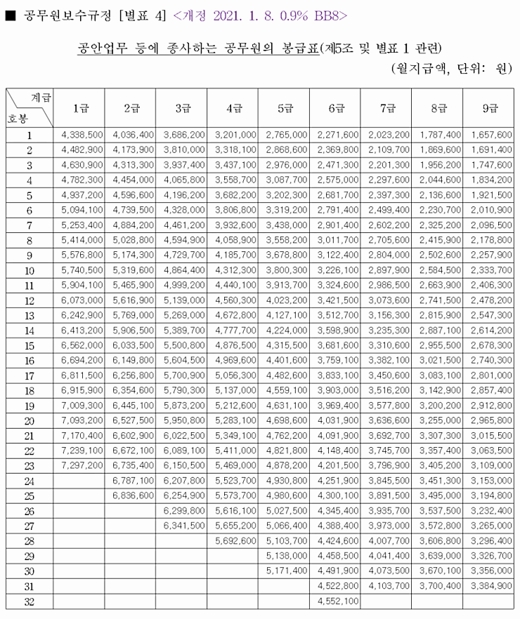 애초에 공무원 노조 측은 3.1% 인상을 주장했고 정부는 1.7% 인상률을 타협안을 제안했습니다. 그러나 2020년 코로나로 인한 경제 타격으로 공무원측도 정부측이 제안한 인상률이 아닌 최종 0.9% 인상률이 결정됐습니다. 우리는 이를 바탕으로한 2021년 공무원 호봉표는 아래와 같습니다.