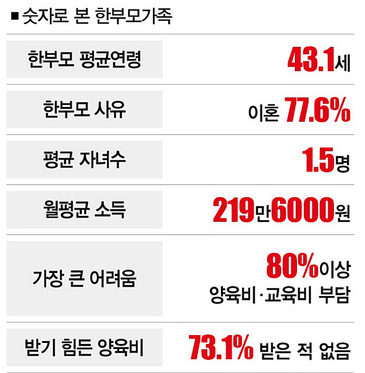 현재 우리나라의 한부모가정은 총 152.9만 가구로 지원대상 가구원이 생계와 주거를 같이하는 경우입니다. 지원자격은 모 또는 부가 18세 미만의 자녀의 생계를 부담하고 있는 경우 그리고 가구의 소득은 중위소득 60% 이하인 경우 지원을 받을 수 있습니다. 만약 아동양육비 등의 추가 지원을 받기 위해선 소득이 52% 이하여야 합니다.